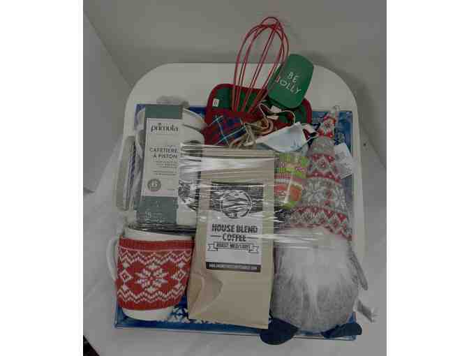 Includes: Pound of Union Street house blend coffee, coffee mug, christmas gnome, oven mitt, whisk, spatula, tiny cupcake papers, a dove cookie cutter on a serving tray.