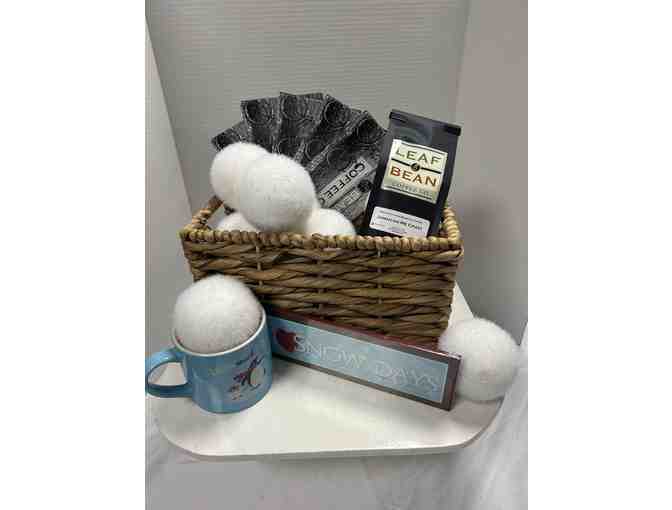 Includes: 1/2 lb Jamaican me crazy coffee from Leaf & Bean Coffee Company, Five (5) $5 Gift certificates from Leaf & Bean, basket filled with fuzzy snowballs, coffee mug and wooden sign.