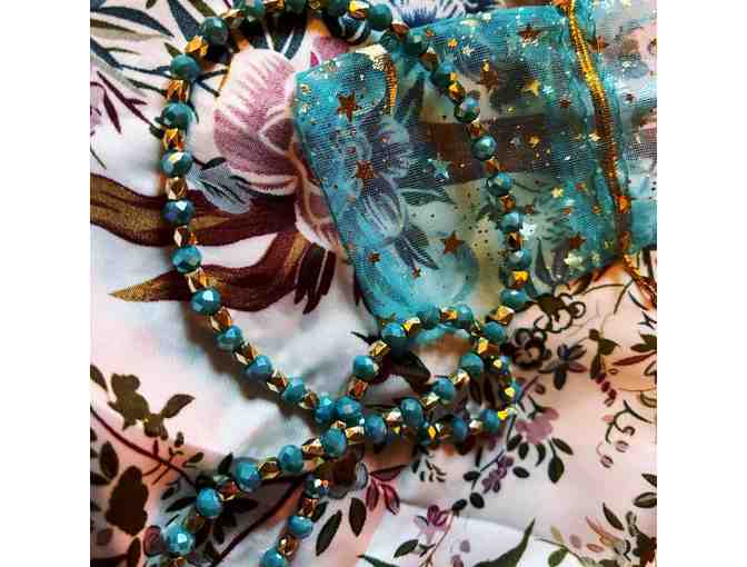 Hand beaded sparkling strand on stretch cord. Glass beads. Just a little longer than choker length, so they can discretely peep out from any collar. Starry organza bag makes a nice stocking stuffer or even a tree ornament.