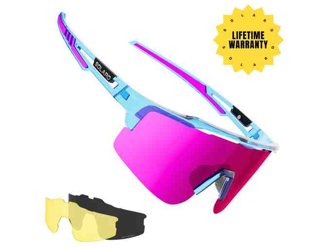 With 3 lenses, a performance-empowering design and premium material, these are next-level glasses for a next-level athlete. FEATURES INCLUDE: - THREE ULTRA PERFORMANCE LENSES - With three HD shielded, performance lenses, these glasses are made for making plays. Includes colored lens, blacked-out lens, and night-vision lens. - VENTILATED LENSES - Strategic grooves in the lenses promote better airflow and reduce fogging. - SOLARO LIMITED LIFETIME WARRANTY - Every pair of Solaro Sunglasses comes with a limited lifetime warranty. Register your pair with us and you'll get one free replacement in case of damage. Just pay shipping. - EYE SAFETY - Protects eyes from dirt, flying debris, and more. These hydrophobic lenses also repel water. UVA/UVB PROTECTION: Solaro's AstroTek lenses are also UVA/UVB protective. - ENHANCED CLARITY - Scratch-resistant, color-enhancing lenses provide better vision and clarity on the field. - SPORTS GRIP - A fitted nose piece keeps these glasses in place as you chase make big plays or hit new PR's. - OPTIMIZED AIRFLOW - With a breathable lens shape and airflow-promoting ridges, these glasses ventilate to reduce fogging. - DESIGNED IN LOUISVILLE, KY - These sunglasses were designed in Kentucky, America. We're not just about horses and baseball bats anymore out here. - COMES WITH EXTRAS - All Solaro Shades come with a box, hard clamshell case, microfiber cleaning bag, and storage bag. No matter where your next adventure is, they'll be ready. The secret is out. These glasses are coming from the same factory that produces other sports sunglasses that cost around $200. Wearing your pair? Tag us on Instagram or TikTok for a chance to be featured on the site!
