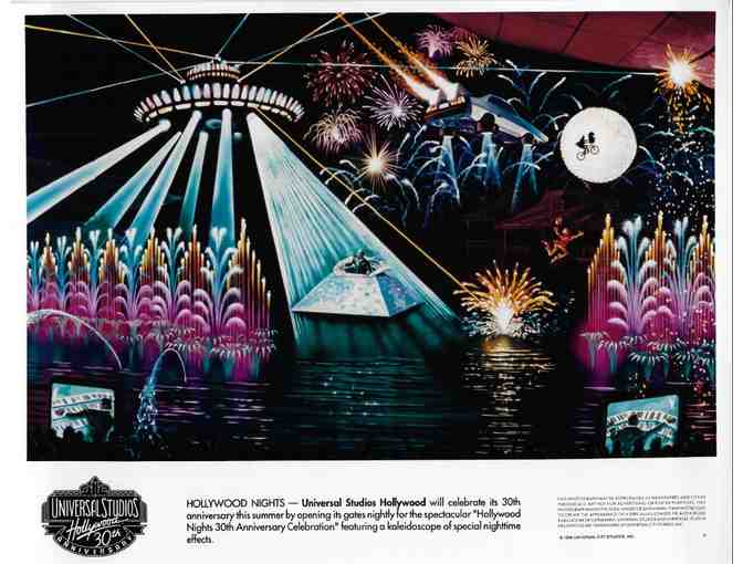 DESCRIPTION: This is a group of 9 promotional stills each measuring 8x10 in a variety of scenes issued by Universal Studios to promote the live tour section of the Universal Park. 7 of the 9 stills have Universal Studios Tour tags with a 1986 copyright date; one still has a 1982 copyright date with a snipe on the back with set description and group contact information and the last still is a color promotional still for Hollywood Nights 30th Anniversary with a 1994 copyright date. SEE IMAGES
