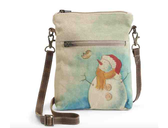 Our handcrafted crossbody bag features a snowman image that looks like a watercolor painting! Outer zip pouch and open pouch. Zip top. Lined, solid back. 100% cotton canvas. 7.5" x 9.5". Removable/adjustable 46" leather strap.