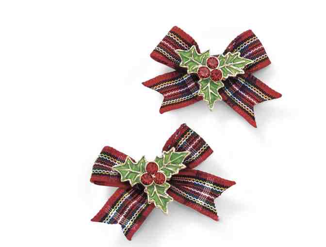 Pretty, red plaid fabric bows with holly berry centers sit on hypoallergenic hooks. Gift boxed.