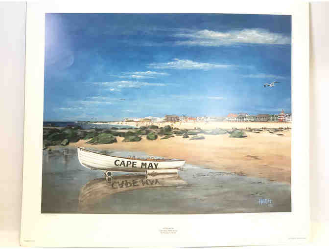 This print, signed and numbered by artist Ronald J. Heath, is entitled "Lifeboat 81." The painting shows one of Cape May's iconic lifeboats with a gorgeous blue sky and the famous Beach Drive houses in the background.