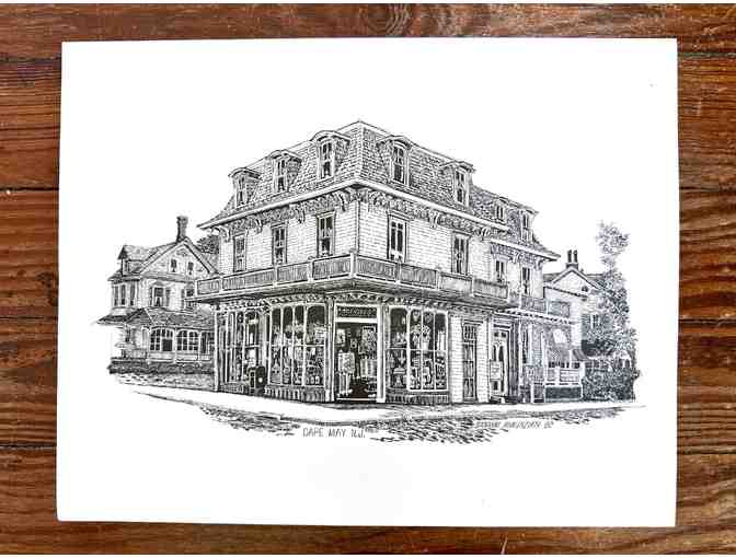 This print depicts Dr. Ware's drugstore, built in 1876. The artist, Giovanni Annunziata, drew the building in 1980 when it was a well-loved antique shop. It is now known as The Queen's Hotel. The New Jersey artist, who passed in 1983, was known for his meticulously detailed drawings.
