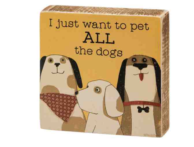 A wooden block sign featuring sassy "I Just Want To Pet All The Dogs" sentiment with rustic dog design. Natural wood sides make the design pop. Wooden wall art is easy to hang via predrilled keyhole slot or can free-stand alone.