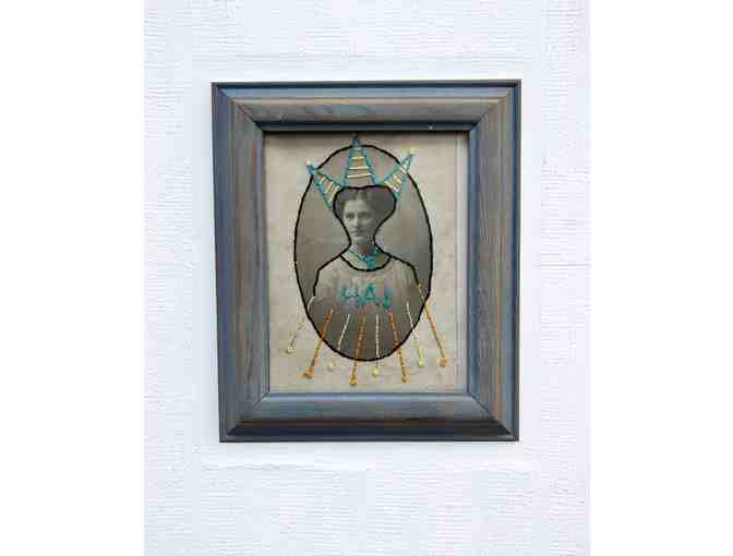 Mixed media framed piece by local artist Penelope Cake. Penelope Cake is a visual artist, choreographer and performer. Her work has been displayed and produced by several venues in Cape May and New York City. She works in collage, assemblage, and embroidery and can often be found at Art Depot teaching classes and encouraging artists, young and old, to discover their creative selves.