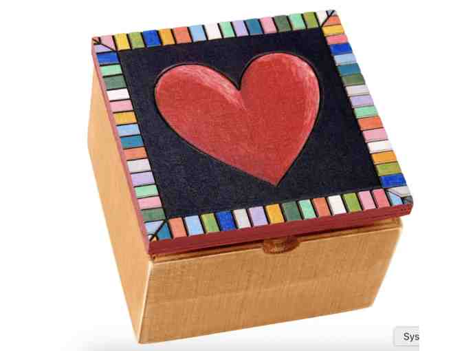 A decorative hinged wooden box featuring wood burned heart design and multi-color border. Perfect for storing treasured keepsakes. This Heart hinged box is great for gifting!