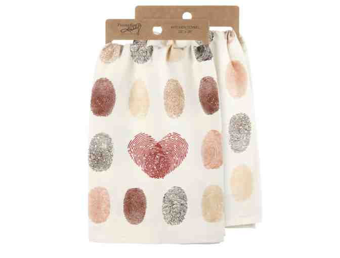 A cream cotton kitchen towel from our Representation Matters Collection displaying an all-over print of diverse fingerprint designs with one design that forms a red glitter heart using two fingerprints. Our Fingerprints kitchen towel is machine-washable for convenient cleaning and glitter will not transfer to other items.