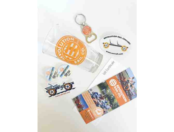 Gift certificate for a quad rail bike tour along with commemorative pint glass, stickers, key chain, and novelty beach tag.