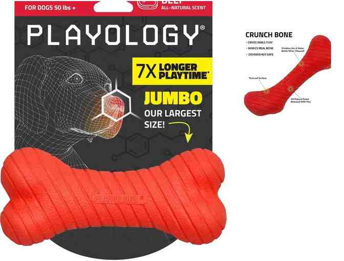 Playology jumbo crunchy femur bone beef flavored dog toy features a crunchy texture and all-natural beef scent, this bone is built to mimic the anatomy of a real femur bone for satisfying chewing fun. 12 inches H x 1.75 inches W x 1.75 inches D Recommended for dogs 50 lbs. and up. Made in the USA. Dishwasher safe.