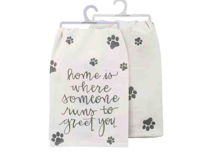 A cream cotton kitchen towel featuring an all-over paw print design and "Home Is Where Someone Runs To Greet You" sentiment. Machine-washable.