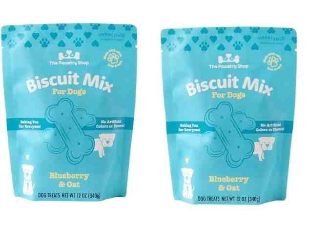 Two 12 ounce bags of blueberry and oat biscuit mix from The Pawstry Shop. No artificial colors or flavors, safe for both dogs and humans. Paw-some treats in minutes!