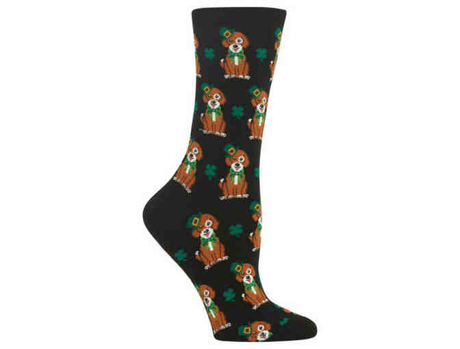 Celebrate St. Patricks Day with these new fashion socks from Hot Sox designed with the dog lover in mind! Fits womens shoe size 4-10.5. 44 percent Cotton, 27 percent Nylon, 27 percent Polyester 2 percent Spandex.