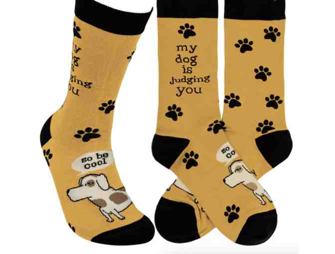 These colorful socks feature woven designs with coordinating "My Dog Is Judging You So Be Cool" sentiment. Cotton, nylon, spandex. One size fits most.