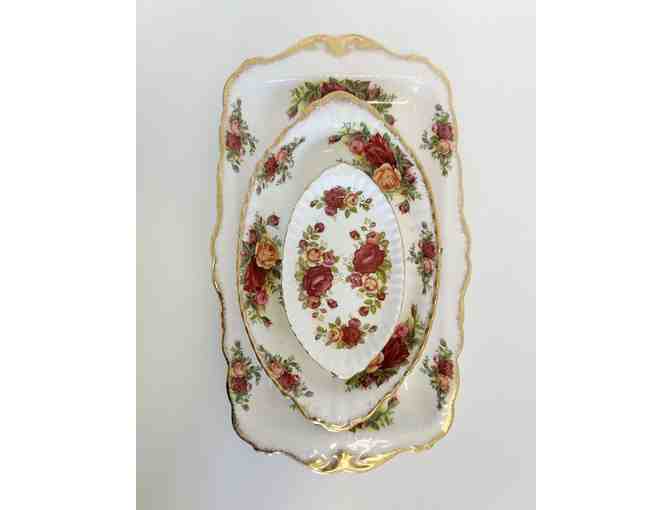 Royal Albert fine bone china tea set for 6 with the "cottage rose" pattern. This set includes cups and saucers for 6 people plus various cake plates and serving platters including a 2-tier cake tray.
