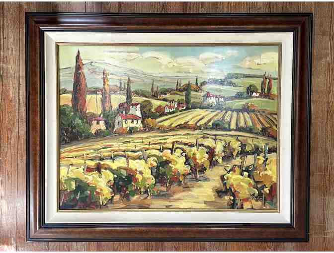 50" x 40" oil painting in a solid wood frame that is 3 inches wide. The impressionist style painting depicts the Tuscan countryside. Originally purchased from a local gallery in Cape May.