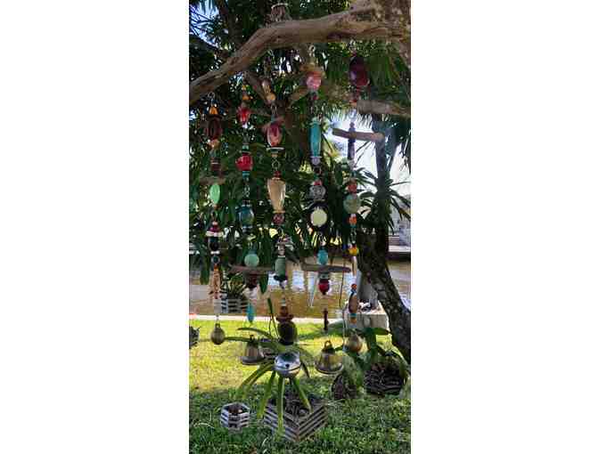 This is a lovely 5 string natural stone, shell, seed, wood, metal hanging with brass bells. One of a kind by local Fort Myers artist - Jayne Baker