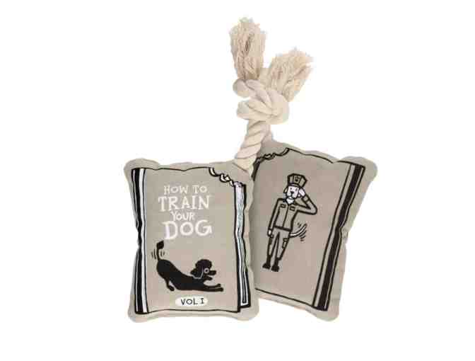 A dog toy from our Pet Collection in the shape of the fun book design displayed on the toy. Cotton dog toy features a double-sided design of a "How To Train Your Dog - Vol 1" book with a bite off the corner and hand illustrated dogs on each side. Our Book dog toy includes crinkle paper inside and a thick braided rope on the corner to entice play. Dog toy is intended for fetching, chewing, and is not meant for rough play. A fun everyday pet accessory great for gifting.