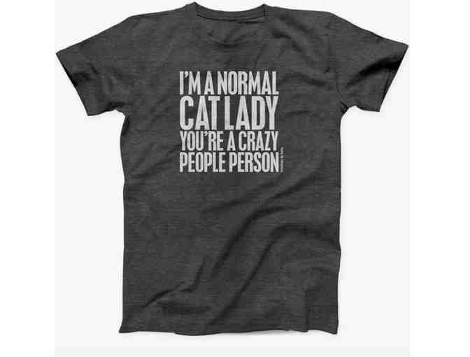 A soft cotton polyester blend t-shirt featuring a box sign style design with "Im A Normal Cat Lady Youre A Crazy People Person" sentiment.
