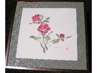 This 26" x 24" Chinese brush painting of a Camellia by Pamela Potter Pearce is framed in the traditional Oriental manner using silk and mahogany wood.