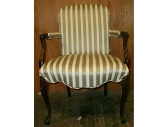 Add beauty and grace to your home with this lovely Queen Anne chair. Soothing colors of sage green and cream stripes will complement almost any decor. Chair is 34" high, 27" wide and 27" deep. Copley Upholstering in West Roxbury has been specializing in reupholstery and custom work for over 50 years.