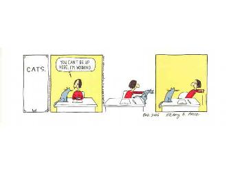 An original three panel "Rhymes With Orange" cartoon by Hilary Price. The title of this strip is "Cats". It is signed by Hilary Price. The whole piece is 12 1/2" x 4 3/4". The actual cartoon strip measures 9" x 3".