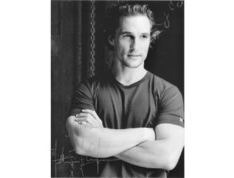8x10 black and white photo signed by Matthew McConaughey. The photo is inscribed "j.k. livin" and signed by Mr. McConaughey. Along with the photo, you will also receive a "j.k. livin" window sticker.