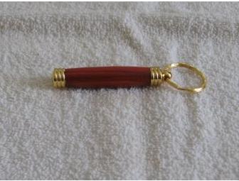 Keychain in Redheart - opens at one end for money or whatever. Hand carved by local woodworker in Vermont.