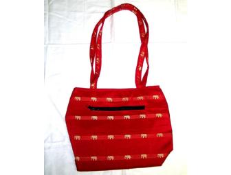 Beautiful red bag measuring 10" x 10" with a zipper pocket on the front. This bag was made in Roteang Village in Cambodia by Peng Sophea and Sem Hum.