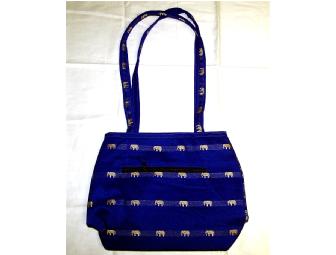 Beautiful blue bag measuring 10" x 10" with a zipper pocket on the front. This bag was made in Roteang Village in Cambodia by Peng Sophea and Sem Hum.