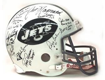 This authentic throwback New York Jets helmet is hand signed by 26 members of the 1969 NY Jets. Signatures include: Al Atkinson, Bill Baird, Ralph Baker, Randy Beverly, Emerson Boozer, John Elliot, Larry Grantham, Cornell Gordon, Dave Herman, Winston Hill, Jim Hudson, Curley Johnson, Pete Lammons, Bill Mathis, Don Maynard, Carl McAdams, Joe Namath, Gerry Philbin, Randy Rasmussen, Paul Rochester, Johnny Sample, George Sauer, John Schmitt, Matt Snell, Bob Talamani and Jim Turner. A Certificate of Authenticity is included.