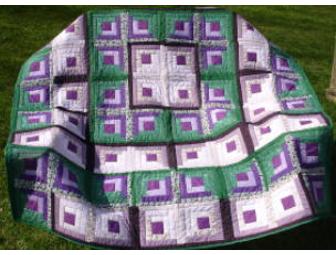 62" by 78" quilt for regular sized bed. Handmade in log cabin pattern. Green, violet,and white. Back is green and white tiny floral print.