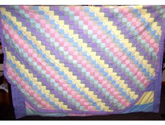 This quilt is made of 3" squares of pastel colors, pink,yellow, blue, green, and lavender. The quilt is bound in lavender and lined in all above colors. It is new.