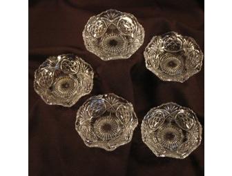 5 Pressed Glass Dessert dishes - can also be used as sauce dishes. 41/2" in diameter; scalloped edge. Donor owned her own antique shop for 35 years. She is now retired.