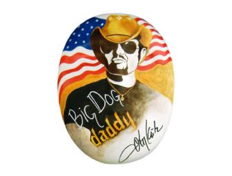 Country legend Toby Keith's visage adorns this mask created by artist Pat Sauter on his behalf. Mr. Keith, in true Country fashion, wears a brown cowboy hat against an American flag background, with the name of his latest album, "Big Dog Daddy," at the bottom. Five of Mr. Keith’s albums and 16 of his songs have reached number one on the Billboard Top Country charts. These songs include, "Beer for My Horses," "I Love This Bar," "American Soldier," "Stays in Mexico," and "Courtesy of the Red, White, and Blue (The Angry American)," a song about his late father's patriotism written in response to the terrorist attacks of September 11.