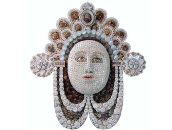 Charles Berendt has been involved in decorative arts in Chicago, New York, Los Angeles and now Denver over a 50-year career. His current obsession is mosaics and buttons which are a challenge but also taming the Aries in him. His mask, "Cassandra," has 1,158 and one-half buttons, 434 beads. He says "no interpretation needed." It stands for itself and is strictly decorative.