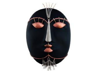 Long Island, N.Y. native Pam Caidin has a degree in forestry from Paul Smith's College in New York and a fine arts degree in metal smithing from Colorado State University. She is a studio jeweler who travels the U.S. doing retail shows and gallery exhibits. Her mask is made of brass, copper, nickel silver and sterling silver hammered, forged and riveted onto the painted clay.