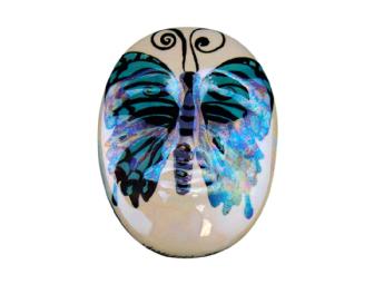 With a BFA from the University of Colorado and post-graduate studies at the University of Denver in art education, Vicki Cook teaches art in the Cherry Creek School District and has her own interior design business. On the day she started her mask, she had been discussing symmetry with her second grade students at Belleview Elementary School. "My examples of faces and butterflies just came together and seemed to work for the design of the mask," she said. She used ceramic glazes and lusters which required three firings in the kiln.