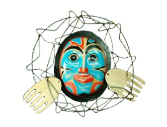 Sharon Schaffner has been working with metals and designing jewelry for 30 years after earning a BFA which put her on a successful career as a studio jeweler and teacher. Her current work reveals a fascination with different cultures, including the Northwest Coast Indian primitive sculptures. Her mask is painted in the style of Northwest Indian style, reminiscent of the ancient hunting mask.