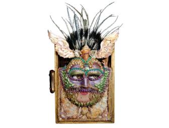 Longmont sculptor Kathleen B. Sherman uses organic material and found objects to create art. Many works are influenced by the imagery used in the art of diverse cultures. Her studio is at 910 Santa Fe Drive in Denver. Her "Mardi Gras in a Box" mask combines shells, beads and other found objects as it evokes the celebration and mystery of the holiday.