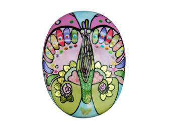 Andrea Hyatt calls her mask "Metamorphis," featuring a caterpillar emerging into a butterfly. "Each of us is endowed with a gift with which to fulfill our potential," she says. She has exhibited in the Northern Colorado Invitational Juried Art Exhibit, Jewish Community Center Collectors Mart Juried Exhibit, and the "Jewish Women in the Arts Show" of the Mizel Museum and Hadassah Denver Chapter.