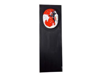Denver artist Amanda Scott combines simplicity and detail in her mask inspired by the works of Hokusai Katsushika and her own island upbringing. "Water Woman" symbolizes the connection between water and man. She graduated from the Art Institute of Colorado with a BA in interior and architectural design. She's exhibited in galleries throughout Colorado. Her muralist work was part of the Santa Fe Art District's Alley Beautification Project. Her work has won awards including 1st Place at the Colorado Springs Parade of Homes. She is an art teacher at KIPP Sunshine Peak Academy in Denver where she coordinates community projects such as the Denver Pavillions "Green for the Holidays" and a display in The Space Gallery.
