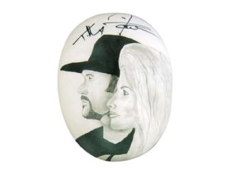 Tim McGraw and Faith Hill are a country music couple with individual headliner careers as powerful, poignant and soulful vocalists. Their lives and their music celebrate life. McGraw and Hill frequently perform at benefit concerts and other events. In contrast to their lives in the spotlight, their mask is a simple black and white sketch of the country music legends, including his trademark black hat and her long blond tresses.