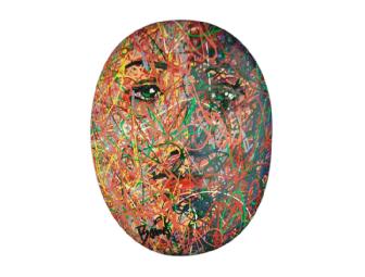 Andy Baird is a Colorado artist who taught art for 32 years and appears in collections in the U.S., Canada, Mexico, Great Britain and France. His mask, titled ?Hope,? is done in his signature style of dropping paint on a surface. In ?Hope,? the rainbow hues of paint landed as narrow, wandering strings of color across the half pink, half purple mask. From the pupil of the right eye, outlined in black, shines a white heart.