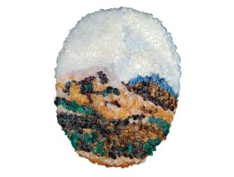 Denver artist and massage therapist Megan Blalock is a volunteer pottery teacher at Mount St. Vincent Home in Denver and volunteers her time as a massage therapist. She is founder of Healing Humanity: Body / Mind Therapies. Her mask, "Up North," is a stone-bead landscape of the northern Rocky Mountains.