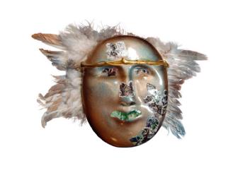 Denver native Shelli Brockman lost two sons - one in 2003 and one in 2004. Her mask represents angel wings with a collage of The Thinker on the front. The Thinker represents her youngest son wondering why he lost his brothers.