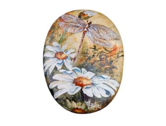 Helene Charland is a Quebec artist who works in all media but enjoys the challenge of watercolor. She holds a certificate of visual art from the University of Sherbrooke in Quebec and has trained internationally in many professional workshops and symposiums. In 2007 she was accepted to the prestigious Societe Canadienne de L'Aquarelle. Her mask, "Lavie en Mouvement," or "Life's Movement," represents the strength of the fragile dragonfly as it moves from flower to flower - representing life's stations and the transitions faced daily by humans in life and beyond.