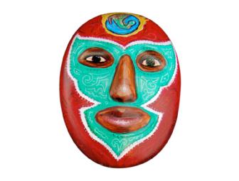 Carlos Fresquez created this this mask of a Mexican Wrestler with a small globe of Mexico on the top. Mr.Fresquez, a professor at Metropolitan State College of Denver, has exhibited his drawings, prints, installations and paintings in over 25 US states and eight different countries at colleges, universities, galleries and museums, including Las Bellas Artes in Mexico City , The Albuquerque Museum, and the National Museum of American Art. A Colorado native, he received a BA from Metro in 1980 and an MFA from the University of Colorado , Boulder in 1995.