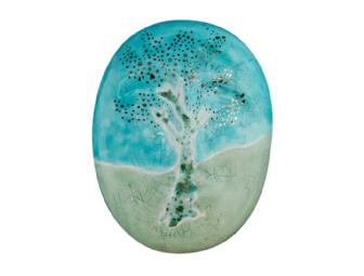 Whitney Heffelfinger, a teacher in Douglas County high schools for 10 years, enjoys experimenting with ceramic glazes and seeing their affects on the clay surface. Her mask includes an image of a tree representing hope, as trees lay dormant through winter and bloom again in early spring. "This tree is a symbol of hope to those family members who continue living the cycle of life without a loved family member," she says.